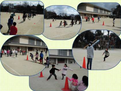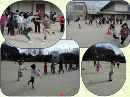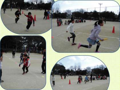 大きなハンデを乗り越えようと4年生が全力で走っていました。2年生も勝とうという思いを込めて走っていました。結果は,2年2組の勝利となりました。