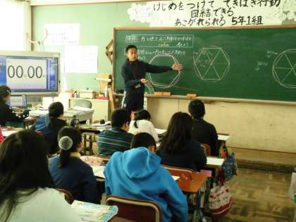 5年1組では,算数で「円を使って正六角形をかく方法を考えよう」という課題で学習していました。
