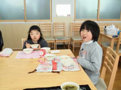 ランチルームで「よく噛んで食べよう」の話を聞いて,給食を食べました。いつもよりしっかり噛んで食べていました。