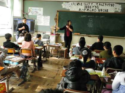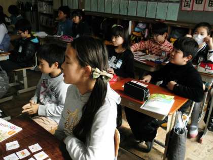 ALTの先生の発音を聞いて,絵カードをとっていました。