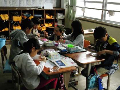 1組では,「磁石にひきつけられるものとの間に( )を入れてもひきつけられるか調べよう」という課題を実験して確かめていました。