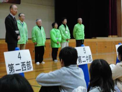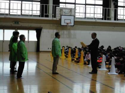 ブロック別集会の後,体育館に集まり,毎日の登校や1年生の下校を見守ってくださっている「見守り隊」の皆さんへの感謝を伝える式を行いました。