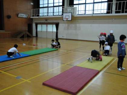 2年1組は,体育館で「マットあそび」に取り組んでいました。