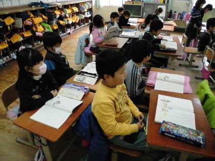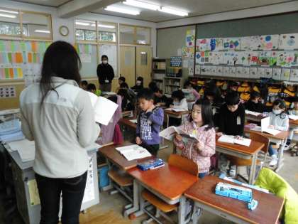 1年1組では,国語で「だって だってのおばあさん」を学習中です。今日は,班ごとに役割を決めて,音読をしていました。