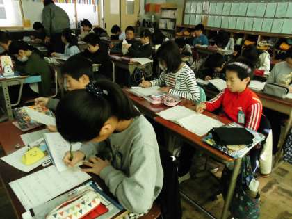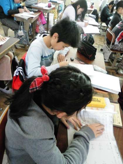 5年1組では,算数で「立体や分数のたし算」等についてのプリントを使って一層の定着を図っていました。