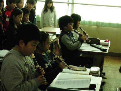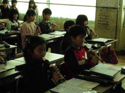 2年生は,4月から3年生になります。3年生から新しく学習する「リコーダー」に学習風景を3年生に見せてもらいました。