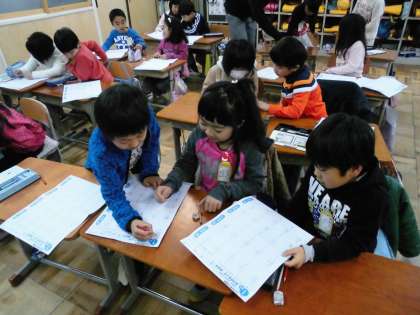1年2組では,これまでに学習してきた漢字をプリントに書き,自分たちで○付けをしていました。このあとは,間違ったところを直します。