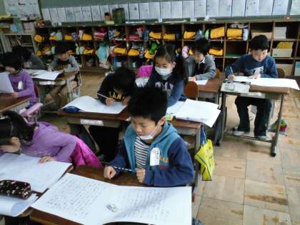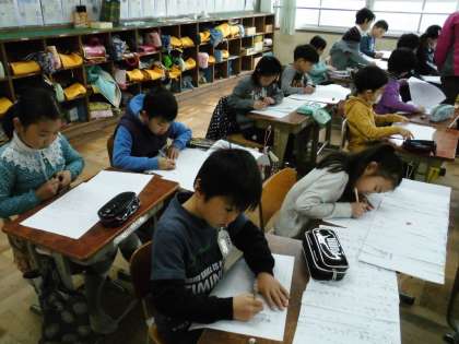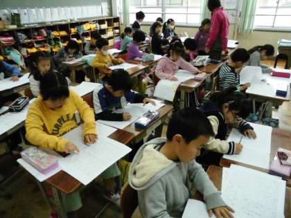 2年1組では,「楽しかったよ 二年生」を学習中です。楽しかった思い出について下書きをし,今日は清書していました。