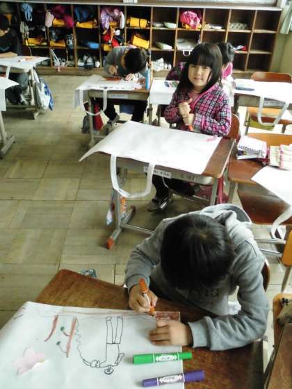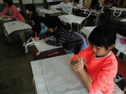 2年2組では,図工の平面作品を持ち帰る袋に思い出の絵を描いていました。