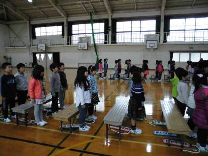 体育館で座って待つ練習をしたり,「1年生の皆さんは立ってください。」と言われてもたちあがらない練習をしたりしています。