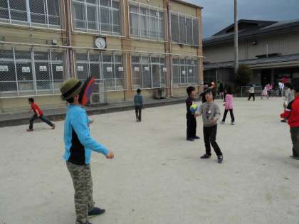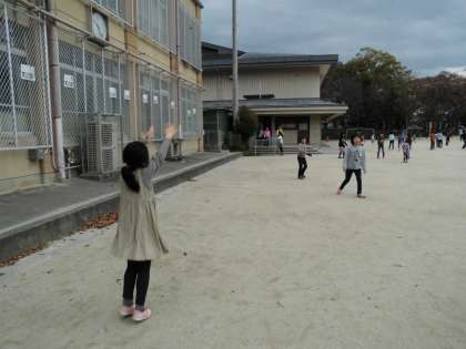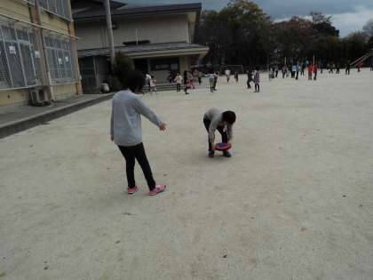 ボールとドッチビーを持って運動場に出ました。投げ合って楽しんでいましたが,前に行かず真上に上がって落ちてきた子もいました。