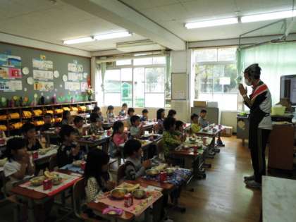 スパゲッティのミートソースは子ども達も大好き。笑顔いっぱいでおいしい給食をいただきました。