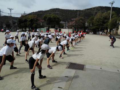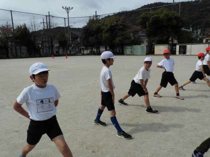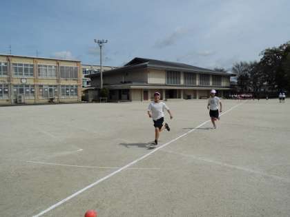 4年生の体育は,準備体操をしてから50メートル走を計りました。
