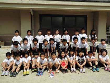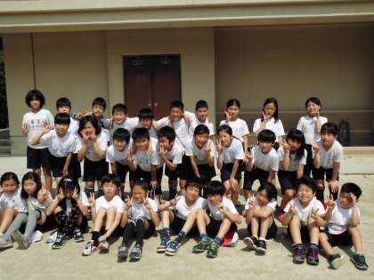 4年生の体育の後に,あおぞらの子たちも一緒に集合写真を撮りました。