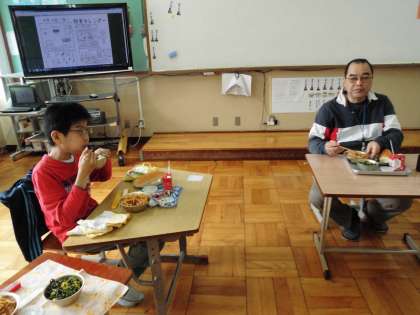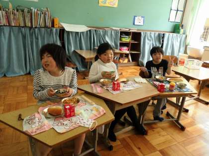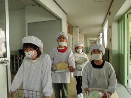 今年度初めての給食です。きちんと身支度を整えて配ぜんしました。みんな完食でした。
