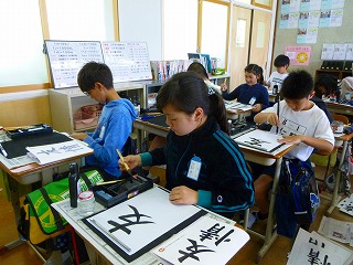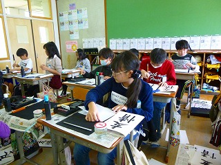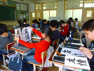 6年生になり,最初の書写の学習です。毛筆で「友情」とかきました。子どもたちは,左右のバランスや筆先の動きに気を付けながら,かいていました。