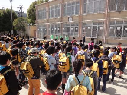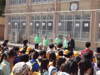 緑のジャンバーを着た見守り隊の皆さんが,みんなが安全に登校・下校できるよう,一緒に通学路を歩いてくださったり,交差点や踏切に立ってくださったりしています。感謝の気持ちを込めて,「おはようございます」「ありがとうございます」「さようなら」の気持ちのよいあいさつができるといいですね。