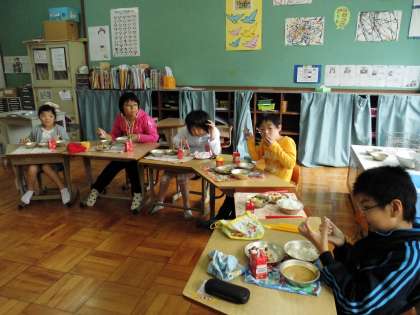 交流学級で給食をしている子もいます。きちんとは配膳していました。あおぞらの部屋では,ボランティアの方と一緒にお話ししながら,楽しく食べました。