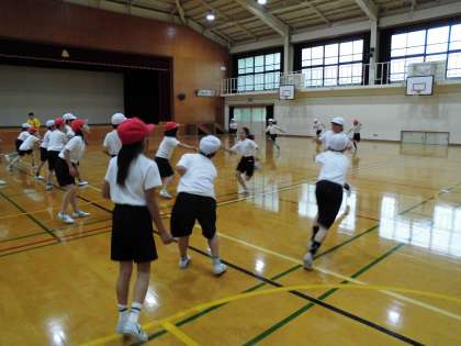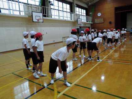体育館でリレーをしました。どのグループも作戦を立てて一生懸命走っていました。