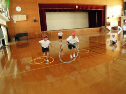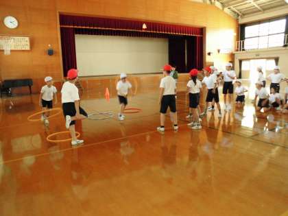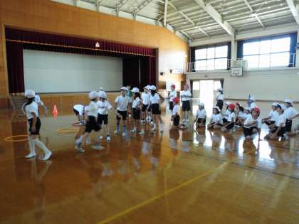 4年1組は,体育館でリレーをしました。フープやコーンも使いました。