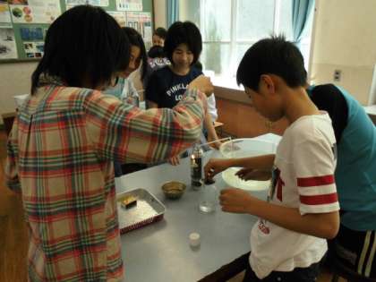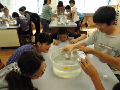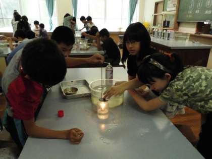 窒素や二酸化炭素の中では,ろうそくの火はすぐに消えましたが,酸素の中でははげしく燃えている様子を観察して,子ども達は目を輝かせていました。