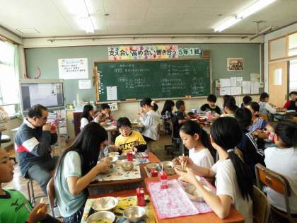 5年2組に給食交流に行きました。「ご飯食べるの早いなあ。」と。実はごはん大好きなんです。」