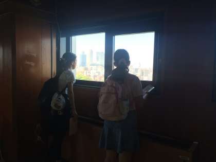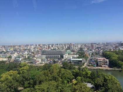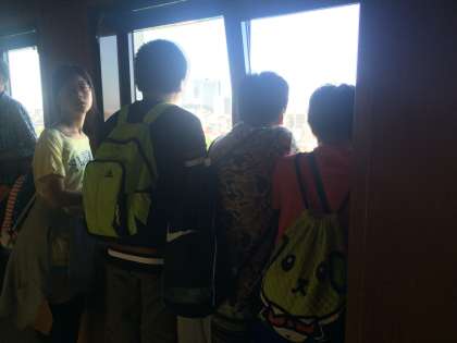 階段をのぼり,天守閣の最上階にたどり着いています。