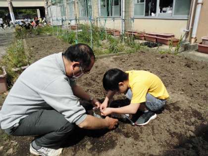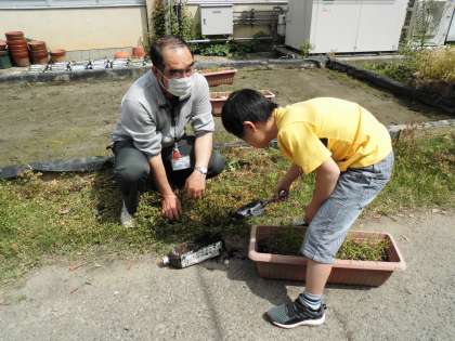 5年生は,米を育てるために,ペットボトルに米の苗を植え替えました。