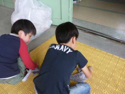 自分の掃除担当場所が終わった子どもが集まり,汚れている部分をごしごしと磨いています。