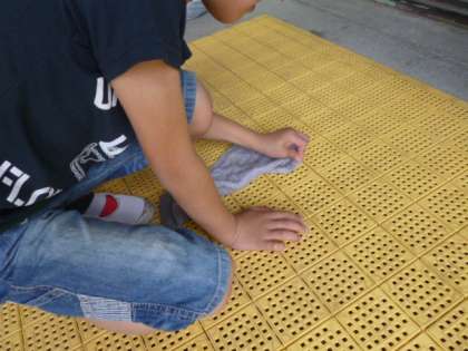 答えは,大渡り廊下のマットを下ぞうきんでふいているところです。