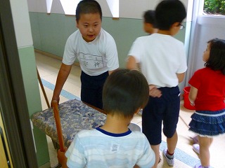 掃除の時間は,6年生が1年生に掃除の仕方を教えながら,一緒に掃除をしています。ほうきでの掃き方や,机の運び方など,1年生に優しく教える姿が見られます。