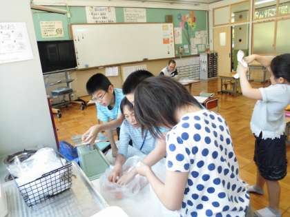 ビワの重さを量ってわり算の筆算をしました。一人当たり何グラムになるか計算して,みんなで協力して,袋に分けて,計量しました。