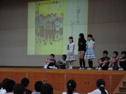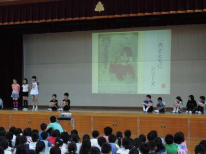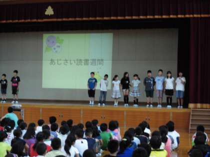 6月13日(月)児童集会で図書委員の児童が,お薦めの本を紹介してくれました。またあじさい読書週間に実施する読書クイズラリーや本の読み聞かせについて説明してくれました。