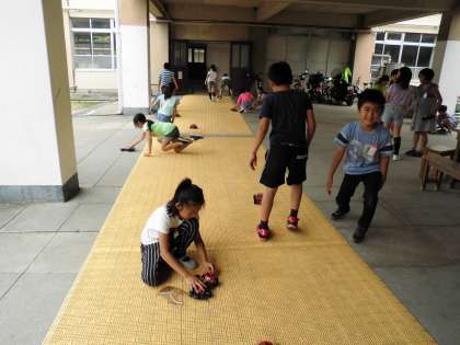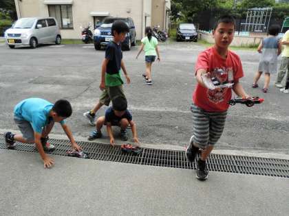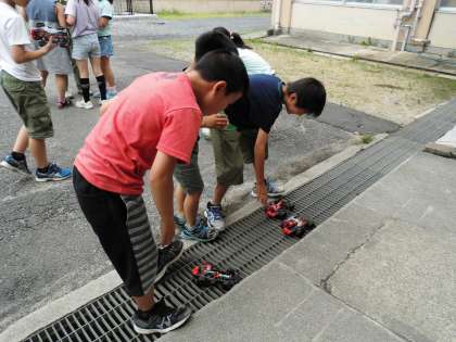 4年生の理科は,単元のまとめをしてからモーターカーを外で走らせました。