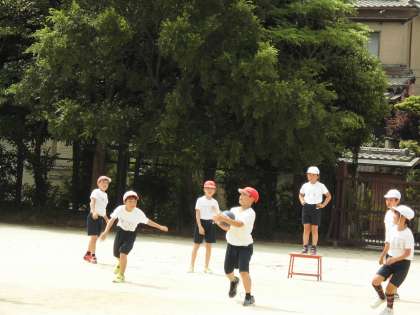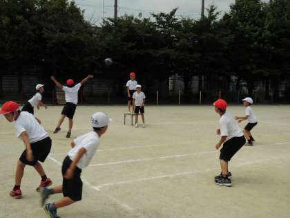 4年2組は,ポートボールの3時間目です。チームのみんなが声かけをして試合をしていました。