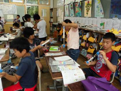 4年1組の理科は,「閉じ込められた空気」の学習で,筒を使って空気を押して手ごたえを確かめました。