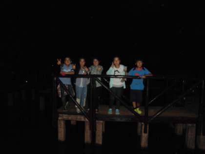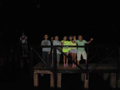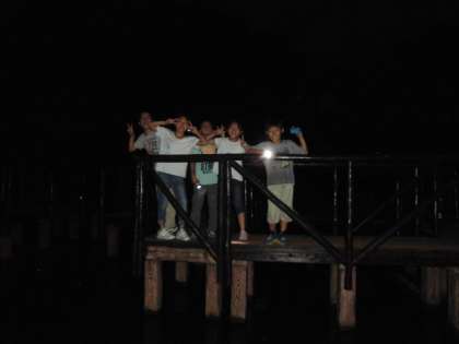 1日目の最後の活動「ナイトウオーク」です。初めの予定では7時開始でしたが,まだ空が明るくて少し開始時刻を遅らせました。昼に一度下見をしていますが,周りが暗くなると雰囲気も変わります。例年のようにお化けがいなくても,カニがざわつく音に驚かされました。グループ写真はなかよし港の近くにある池に架かる橋の上で撮影したものです。
