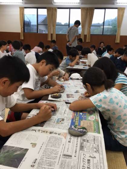 雨が降っているので,午前中に予定していた浦山ラリーは中止。60畳の部屋で「貝殻ペイント」をすることにしました。