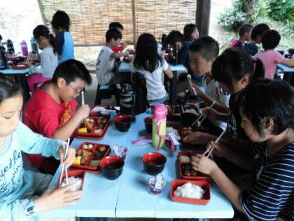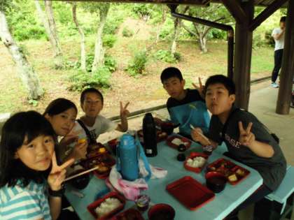 夕食は東屋で食べました。今日は朝食がプレイホール,昼食は60畳と毎回食べる場所が変わり,その場の雰囲気を楽しむことができました。