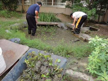 ビオトープでは,循環器のモーターがうまく作動するよう,池の底の泥をかき出しました。水生植物もぐんぐんと成長しています。
