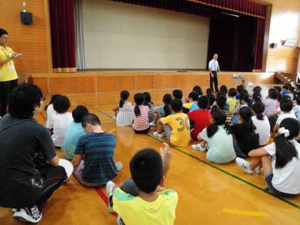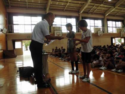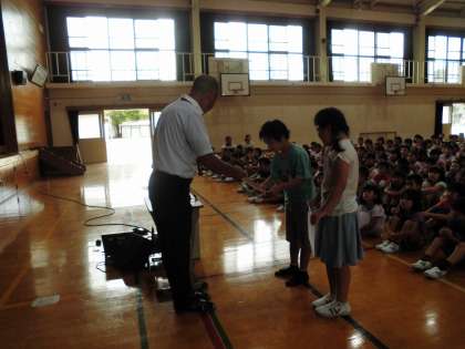 学校が始まりました。まずは,全児童が集まっての朝会です。校長先生の話を聞いてから,いろいろな表彰がありました。あおぞらの子たちも,絵画で賞状をもらい嬉しそうでした。