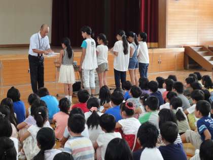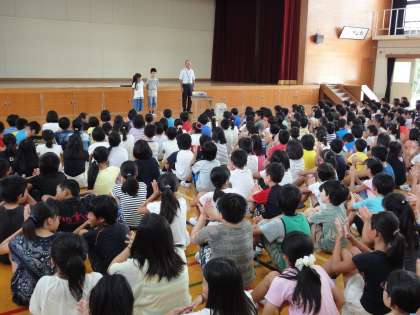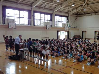 1時間目は朝会。全学年の児童が体育館に集まりました。