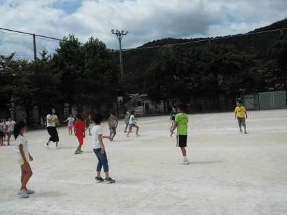 暑いけれど,子どもたちは元気に運動場でドッジボールをして遊びました。先生も一緒に遊んでいました。