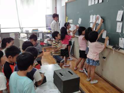 2年生は,国語の学習で,漢字の部分を組み合わせる問題を解いたり作ったりしました。自分で作った「漢字を合体させるクイズ」を,参観している保護者に「これ,わかる?」と出題している子もいました。