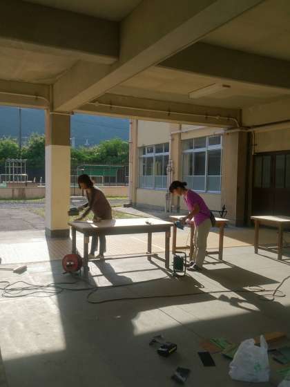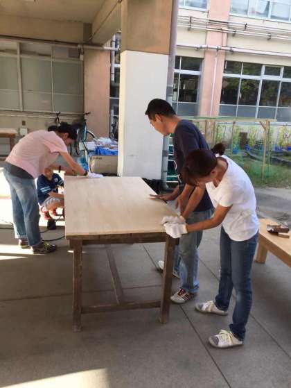 子どもたちの憩いの場となっている大渡り廊下の野外テーブル。長年の使用で劣化し,宿題をする子どもたちから字が書きにくいなどの声が上がっていました。そこで先週末,本部役員で補修を行いました。また笑顔で子どもたちが集ってくれたらいいなと思います。