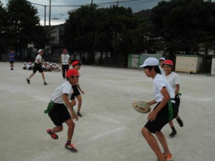 タグラグビーのルールを教えてもらった後,6チームに分かれてミニゲームを行いました。初めて体験する子どももたくさんいて,新鮮な気分で取り組むことができました。