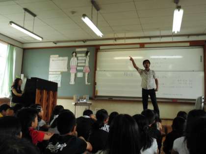 9月13日(火)5年生を対象にオペラ歌手による声楽特別授業が開催されました。初めにイタリアのカンツオーネ「オーソレミオ」,2曲目は日本の歌「夏の思い出」,3曲目はオペラ「フィガロの結婚」より「もう飛ぶまいぞ この蝶々」,最後はオペラ「カルメン」より「闘牛士の歌」を歌ってくださいました。迫力あるピアノ伴奏と歌に子ども達はすっかり魅了されました。