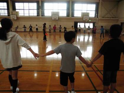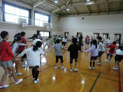 キャンプファイヤーの時に踊る「マイムマイム」を練習しました。みんなで手をつないで楽しかったです。