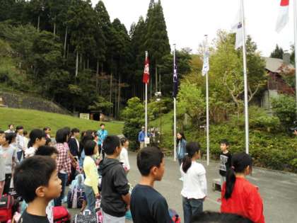 11時過ぎに山の家に到着しました。初めに入所式です。「これから3泊4日お世話になります。」の気持ちをこめて挨拶しました。山の家のシュレーゲンアオガエルのマスコットもお出迎えしてくれました。