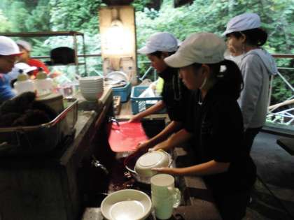 第2炊飯場でカレー作りを行いました。初めに使う食器や調理用具を洗剤で洗います。